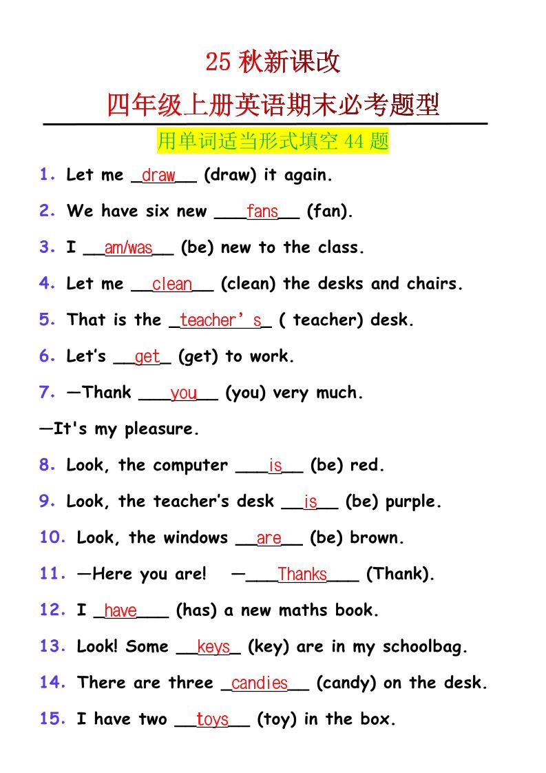 【2025秋新版】四年级上册英语用单词适当形式填空44题