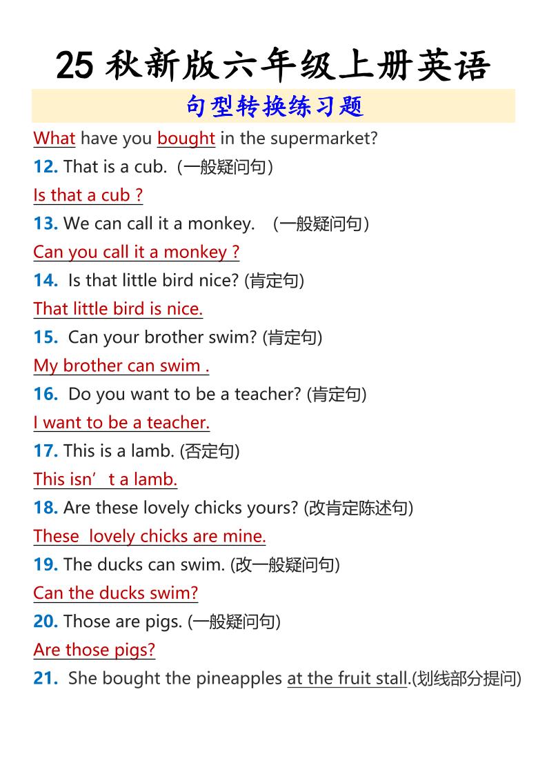 【2025秋新版】六年级上册英语句型转换练习题-云科数创