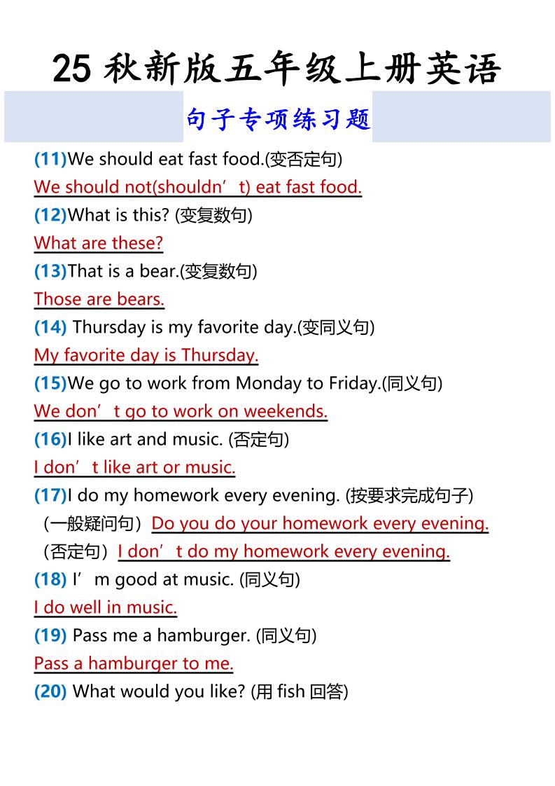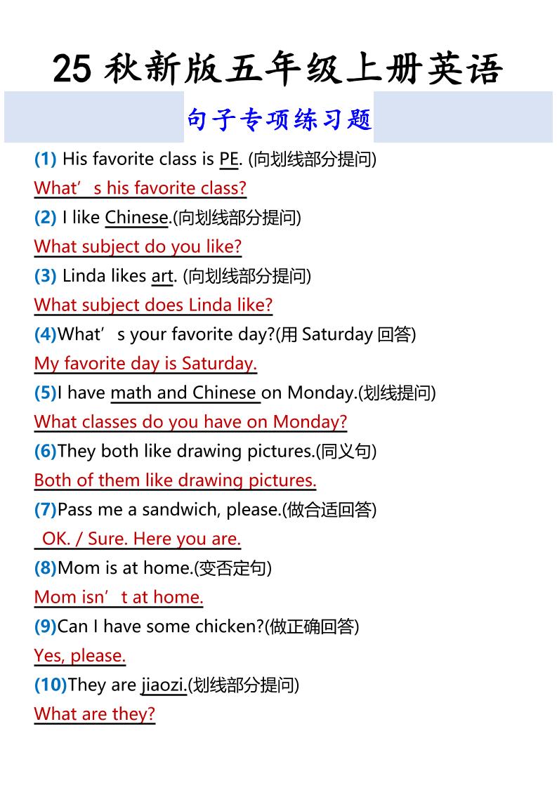 【2025秋新版】五年级上册英语句子专项练习题-云科数创