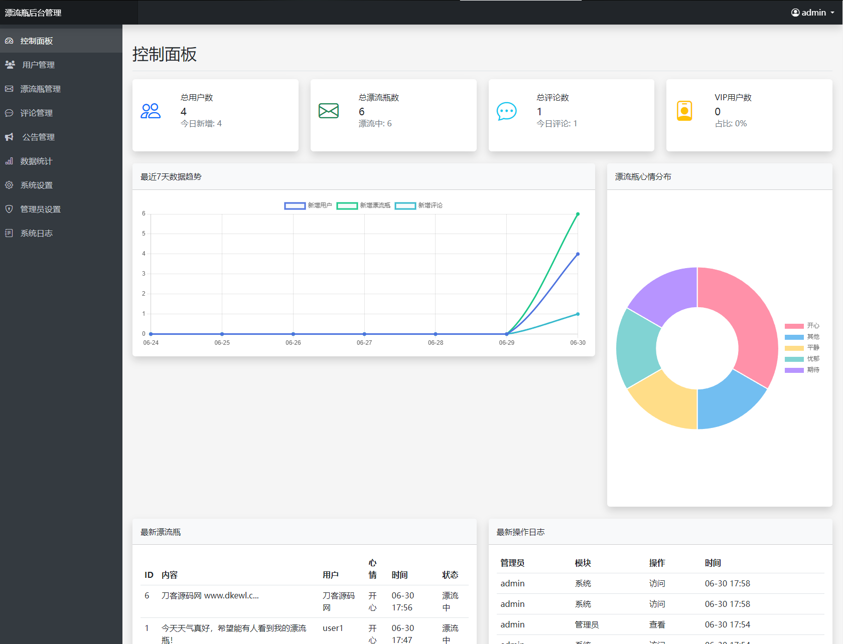 数据统计:监控用户活跃度、漂流瓶数据、系统运行状态。