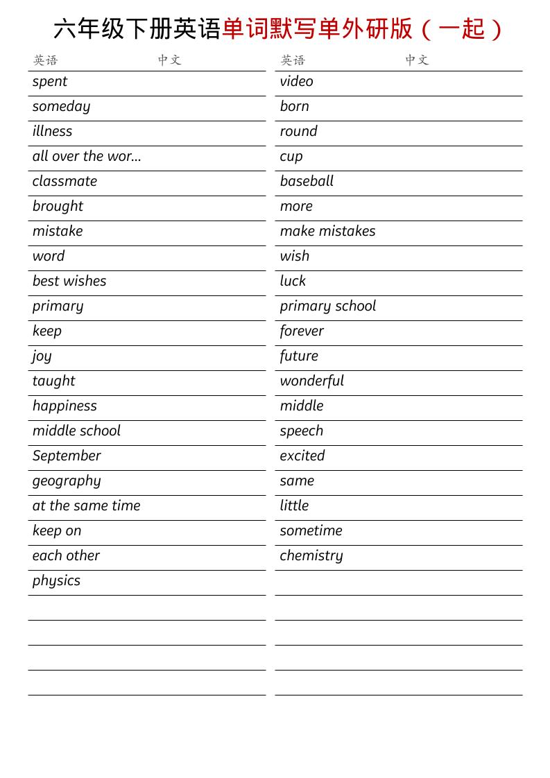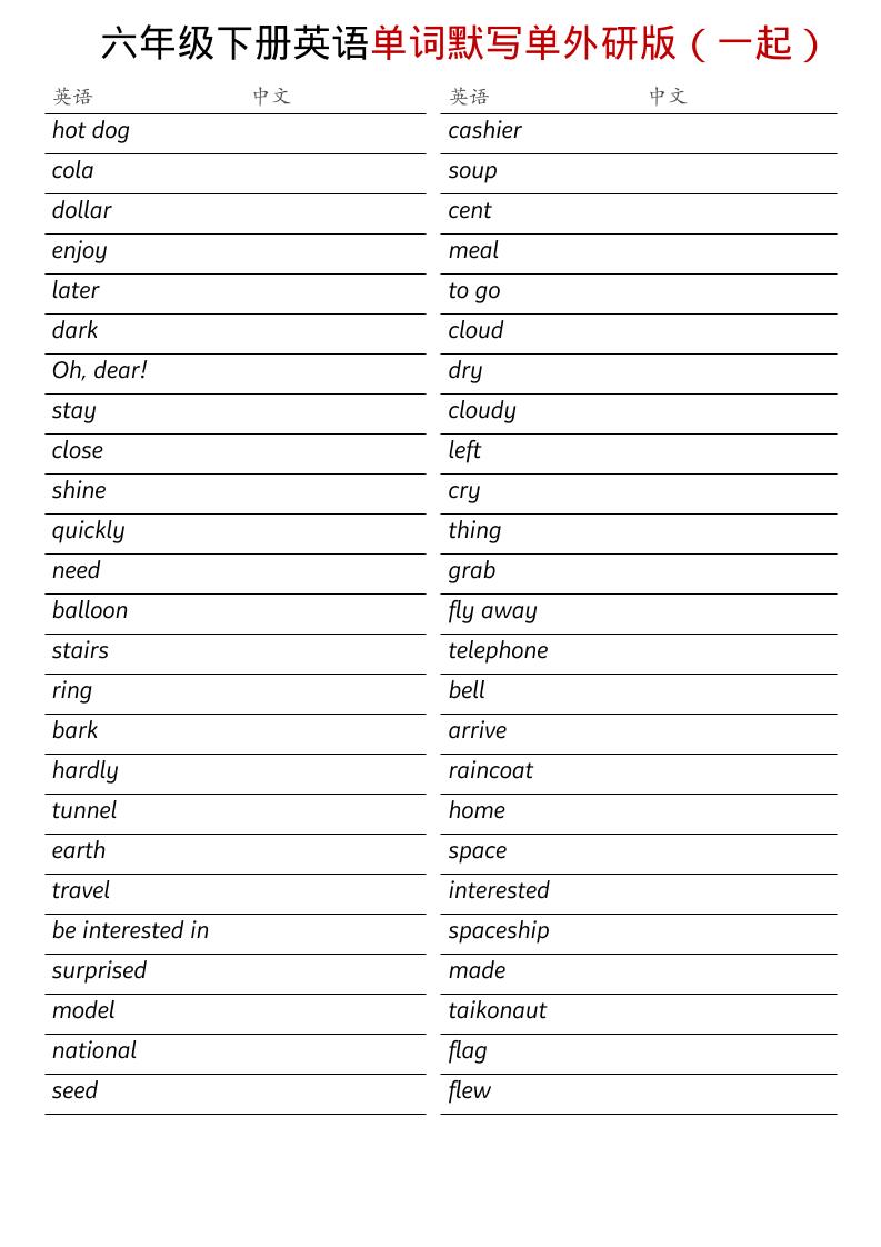 六年级下英语全册单词默写单《外研版(一起)》-云科数创